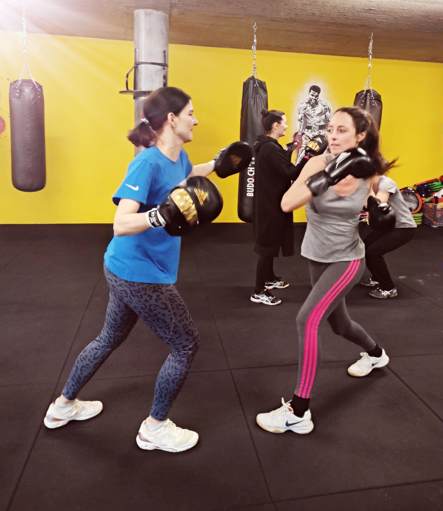 Nicht eine der anwesenden Frauegrüpplifrauen war bis zu diesem Morgen in einem Box-Club. Also so richtig aktiv. Und so kamen alle irgendwie auf die Welt. Schon beim Anziehen der Bandagen für das Handgelenkt und die Knöchel überkamen die eine oder andere etwas bedrohliche Gefühle: Was erwartet uns denn da!? Nun: zwei Stunden mit Coach Sandro und seiner Assistentin Marzia. Und die hatten es so richtig drauf.