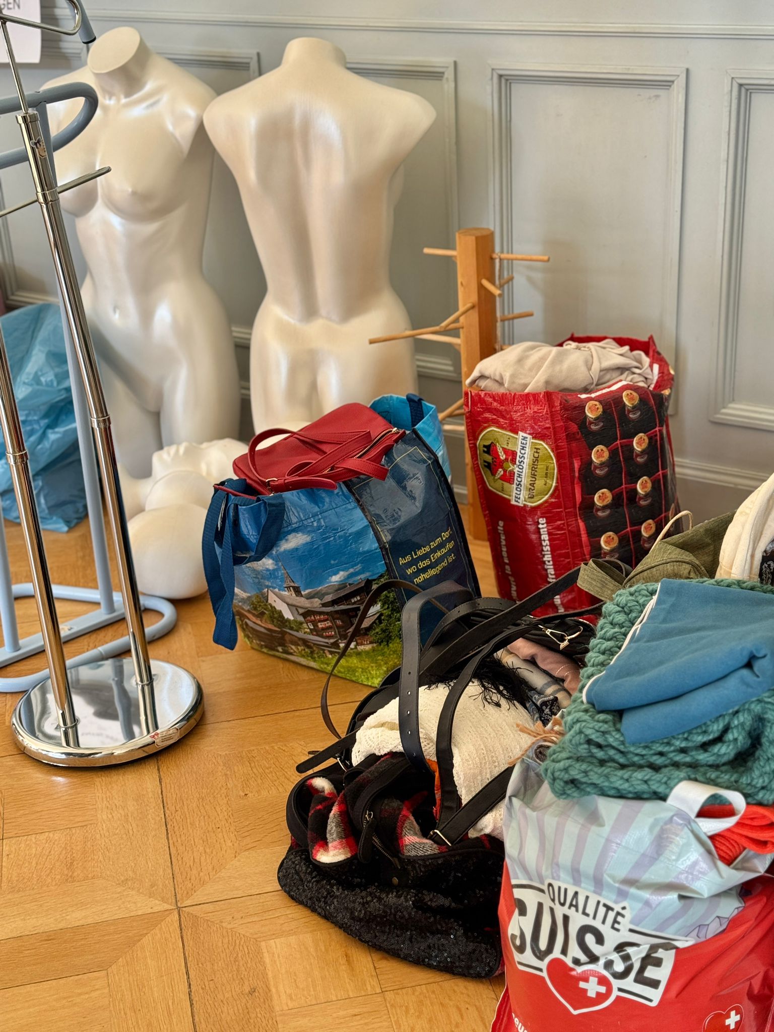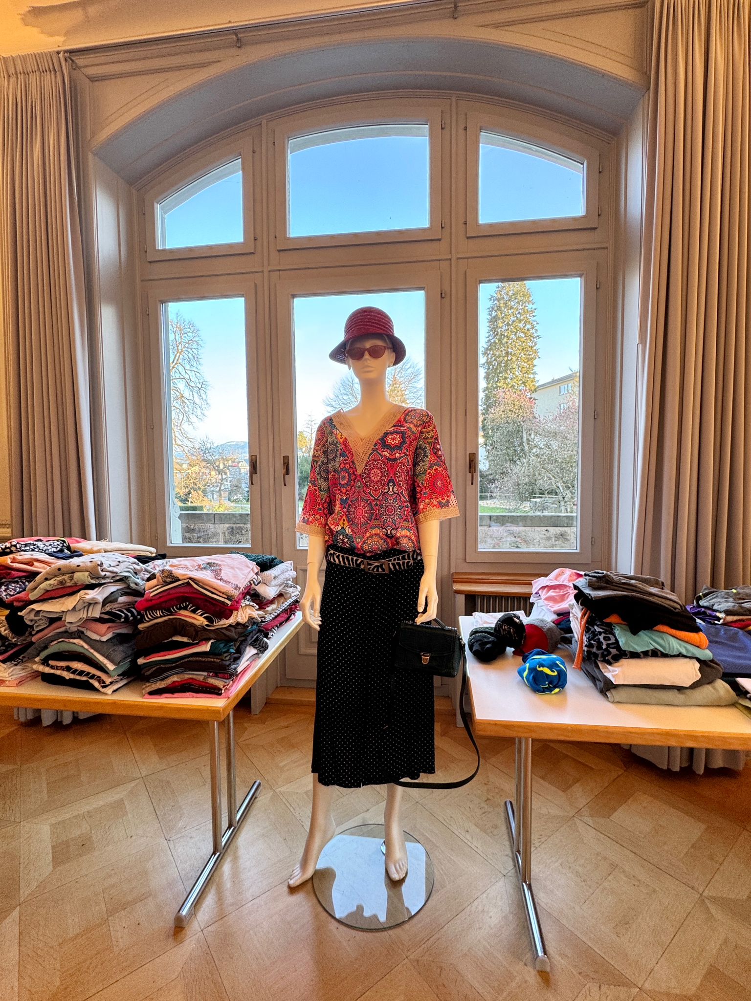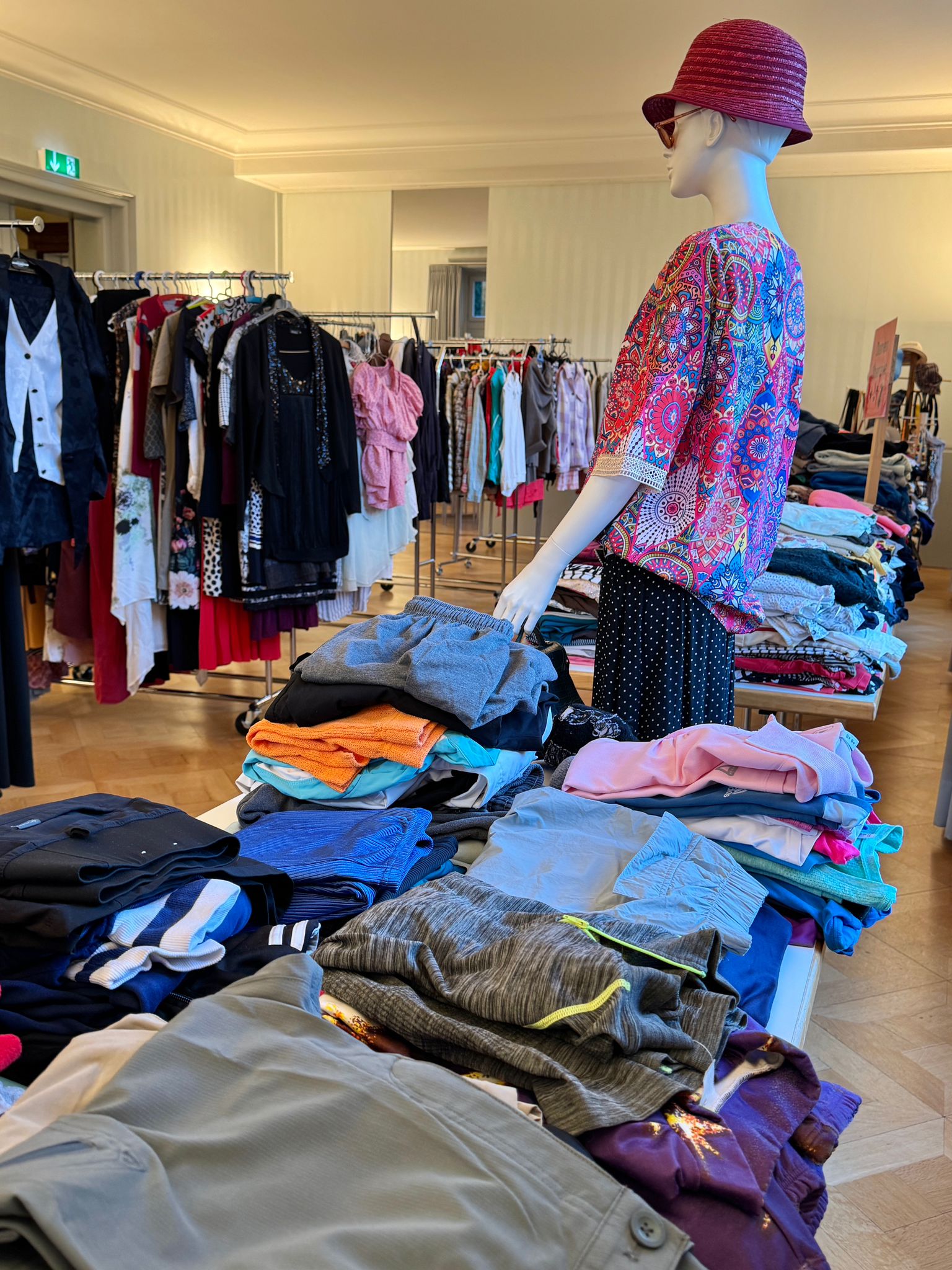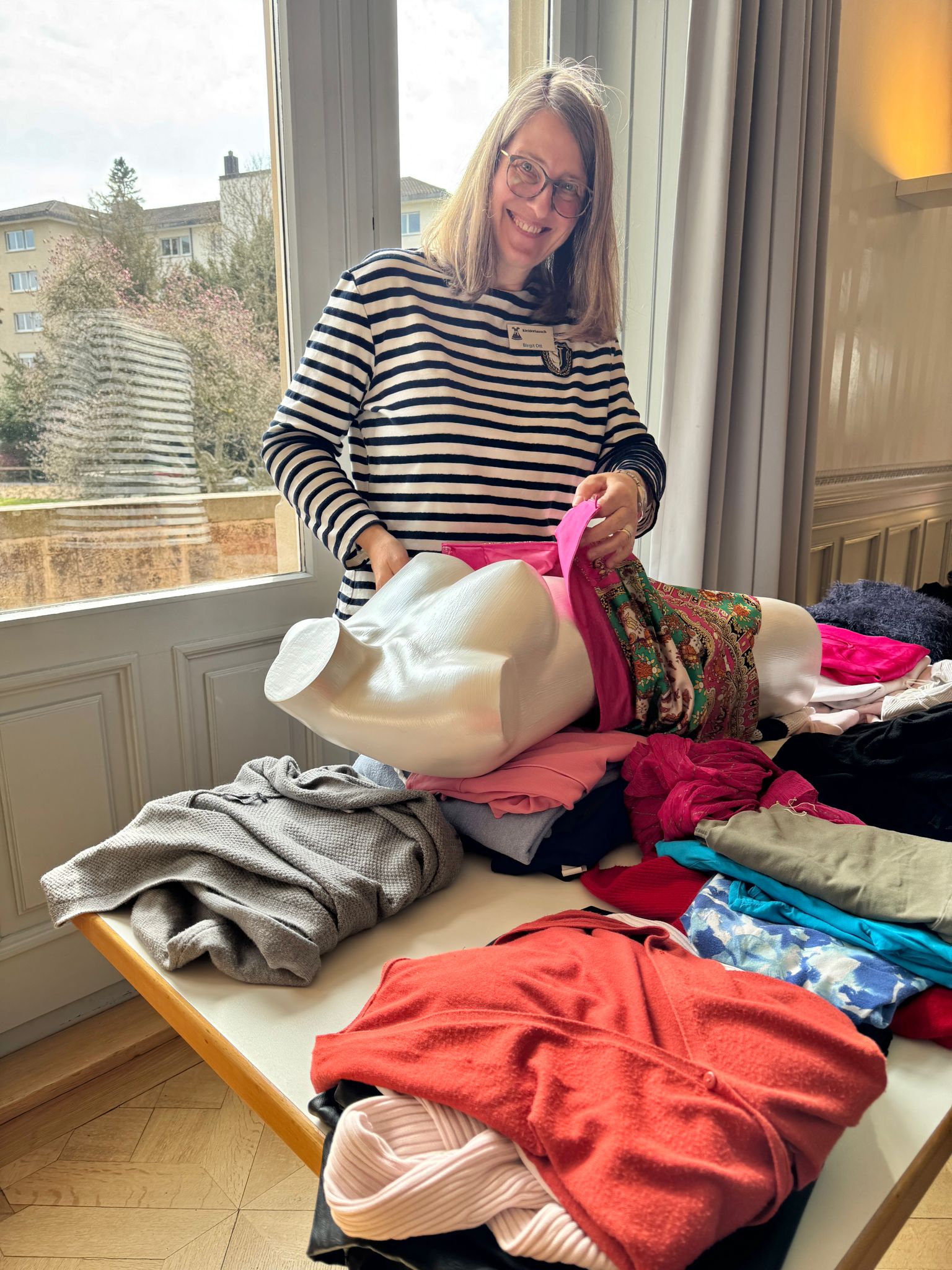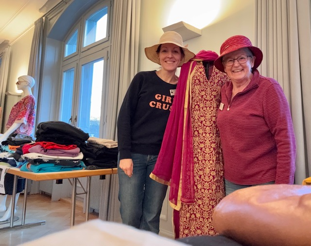 Das Kleidertausch-Team nahm im Laufe des Freitags wieder unzählige Säcke und Tüten mit Kleidungsstücken entgegen. Bis am Abend waren alle sortiert, zusammengelegt, gestapelt, auf Bügel gehängt, auf den Tischen ansprechend präsentiert oder wurden als inspirierende neue Kombination auf den Kleiderpuppen drapiert.