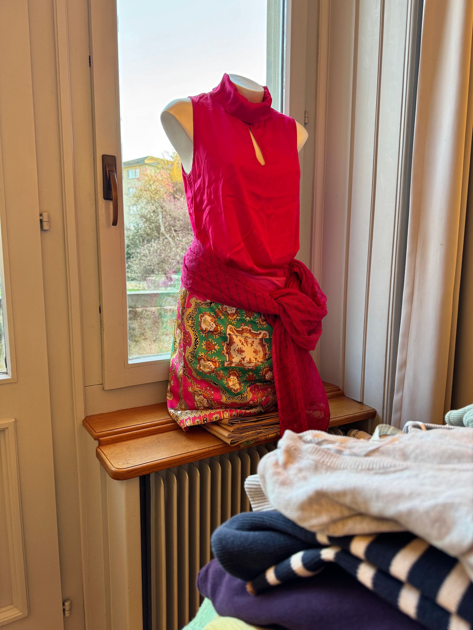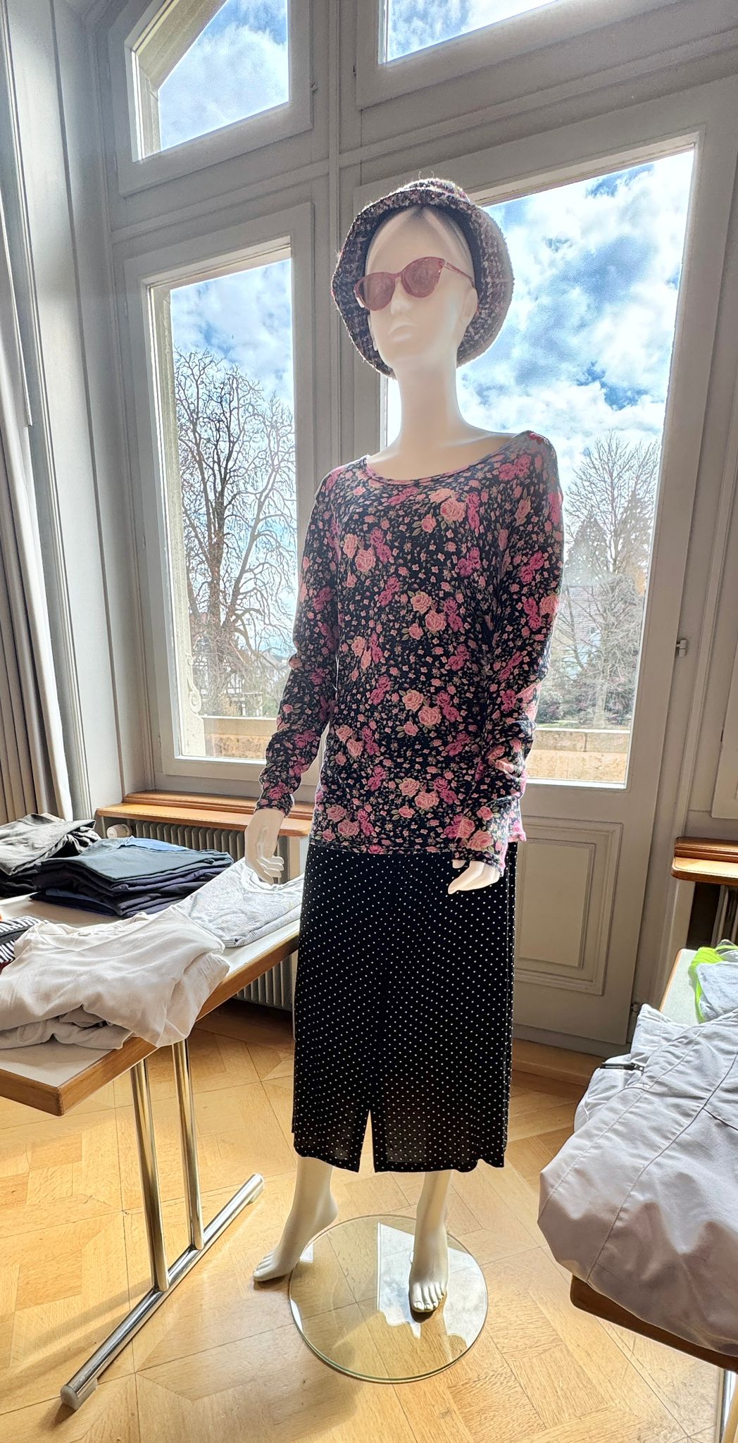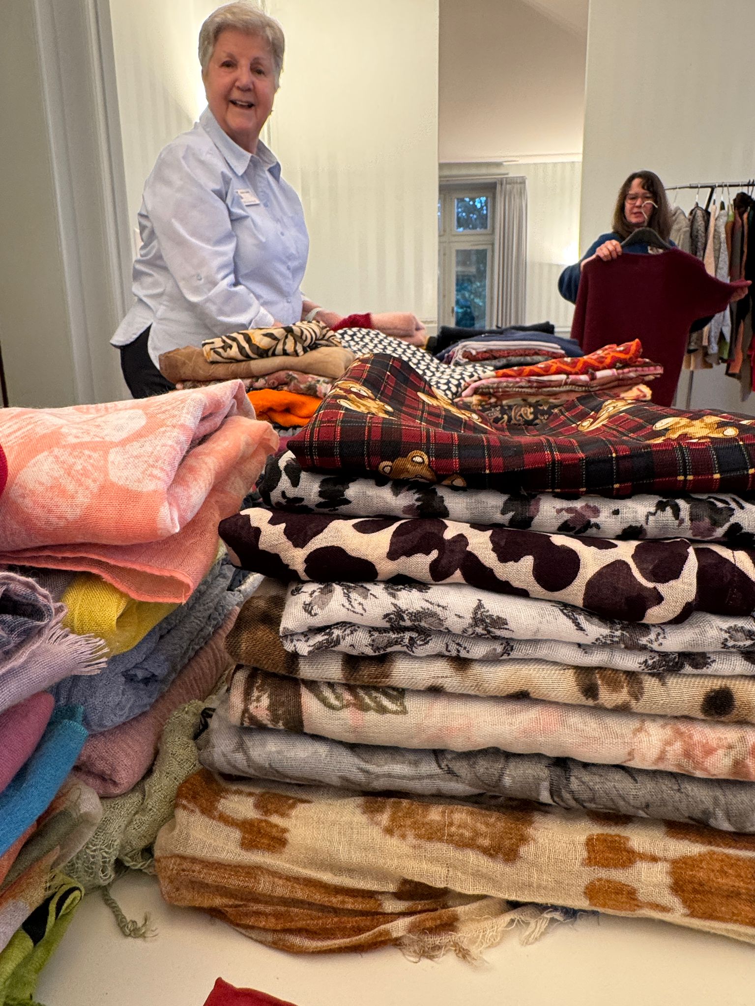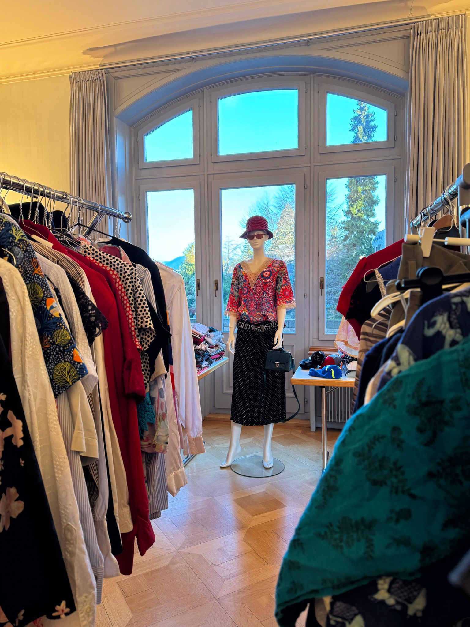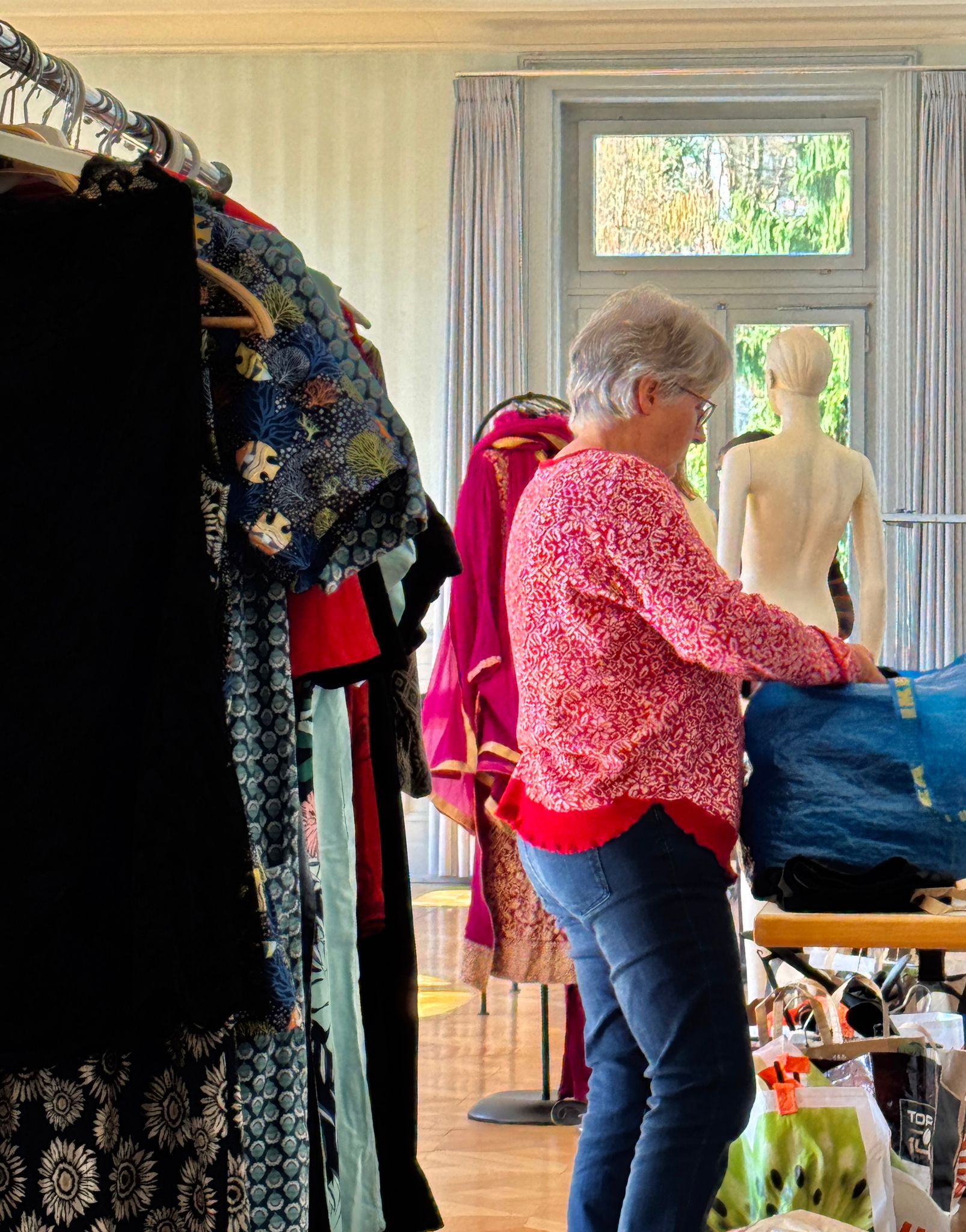 Das Kleidertausch-Team nahm im Laufe des Freitags wieder unzählige Säcke und Tüten mit Kleidungsstücken entgegen. Bis am Abend waren alle sortiert, zusammengelegt, gestapelt, auf Bügel gehängt, auf den Tischen ansprechend präsentiert oder wurden als inspirierende neue Kombination auf den Kleiderpuppen drapiert.