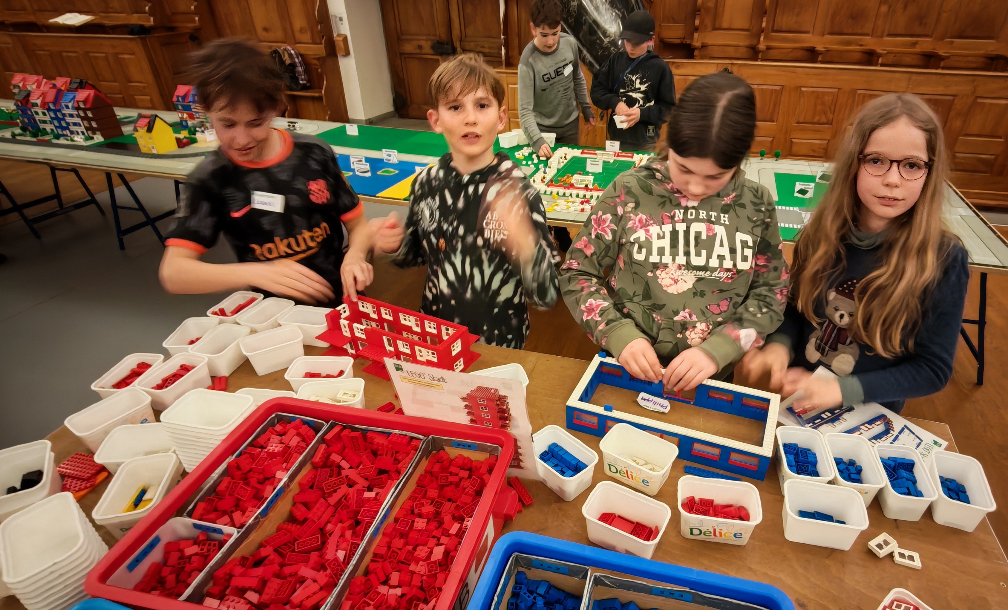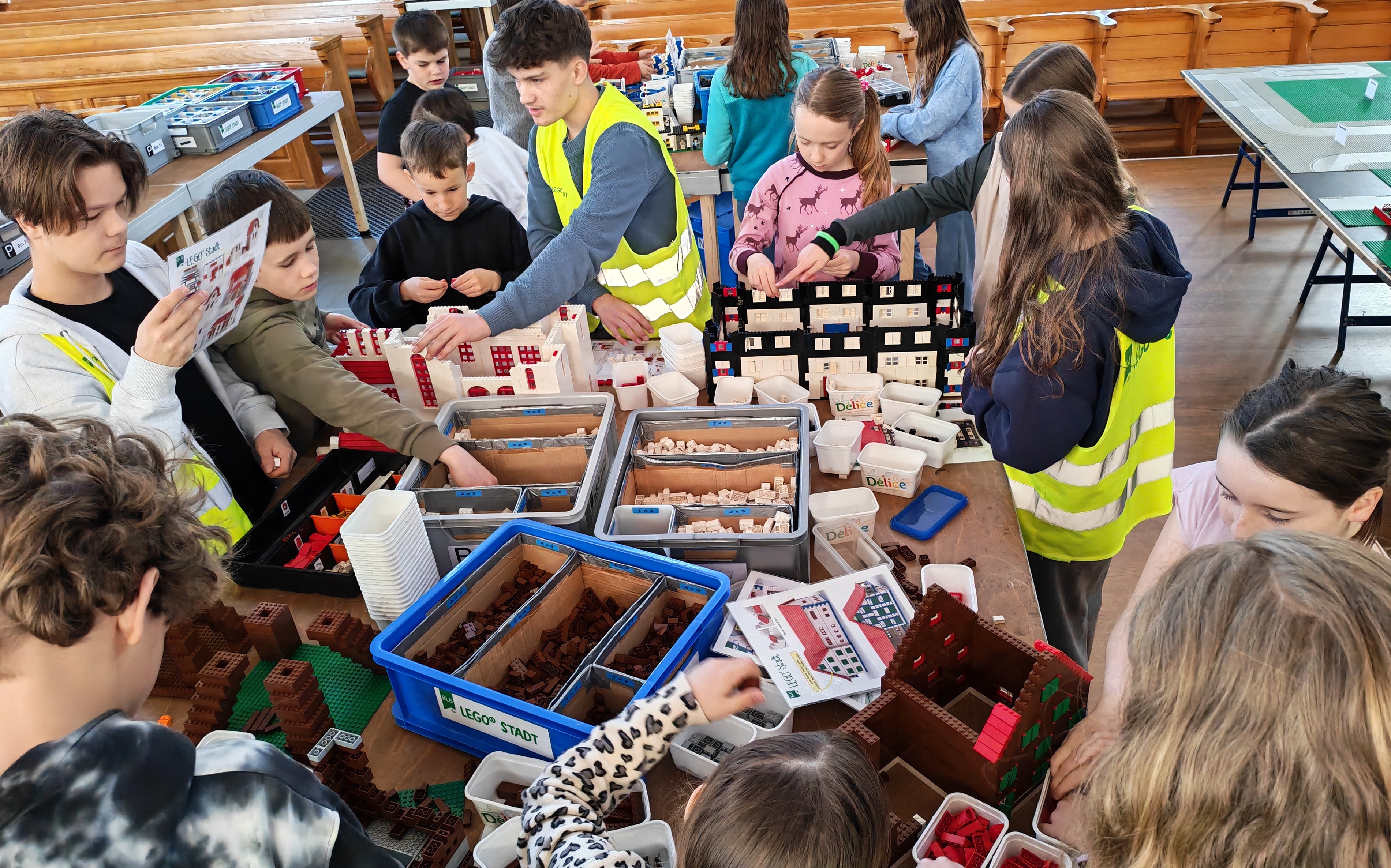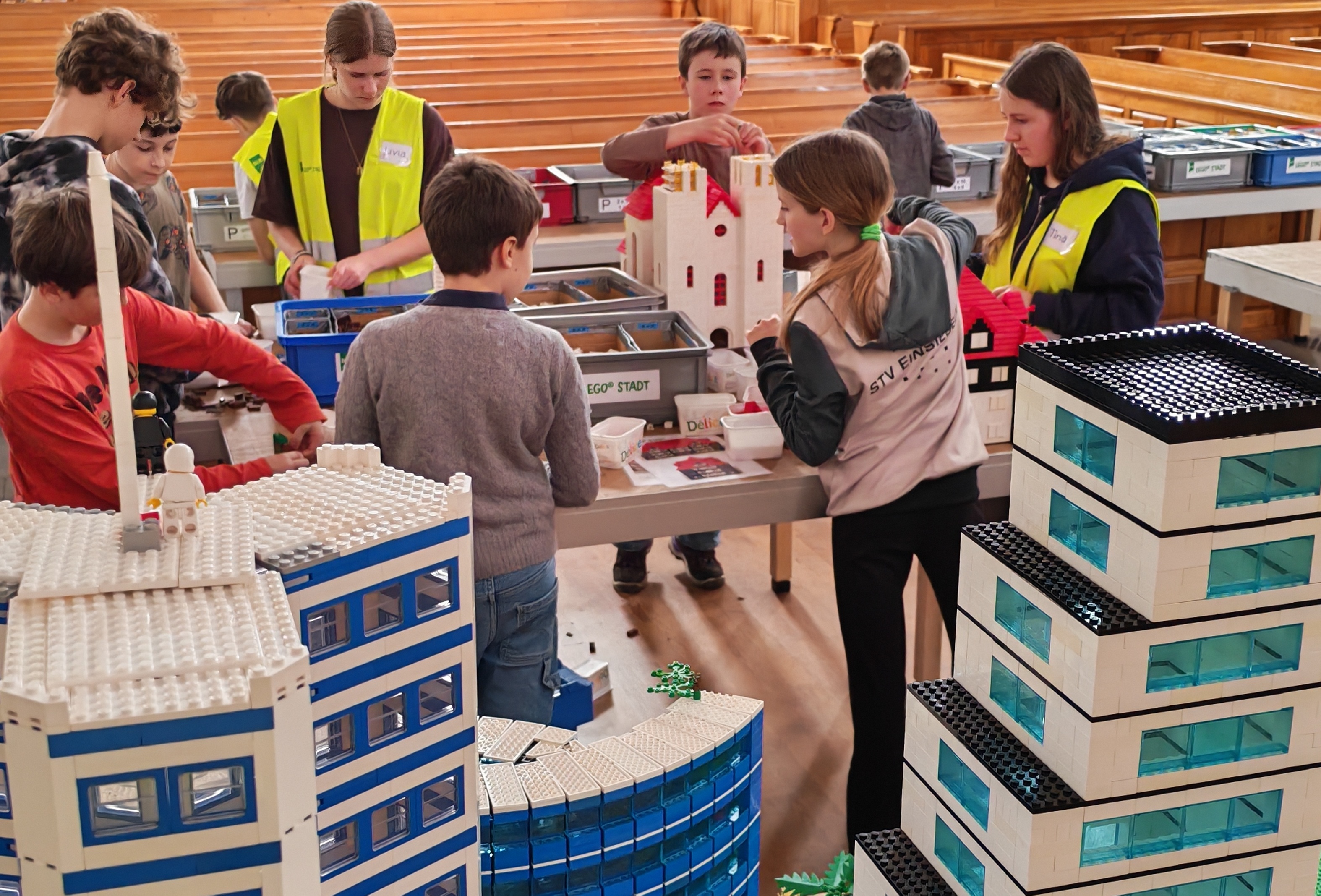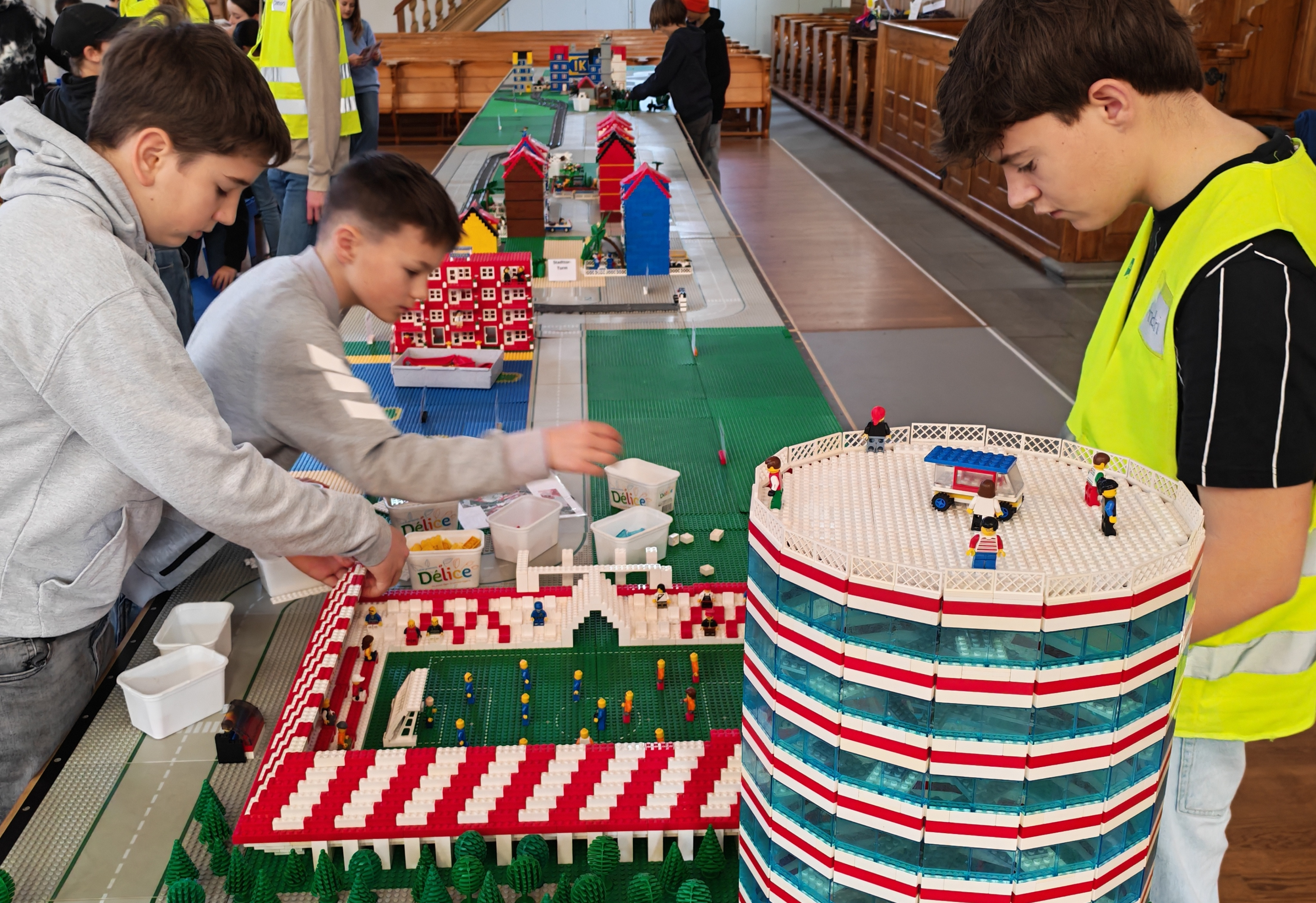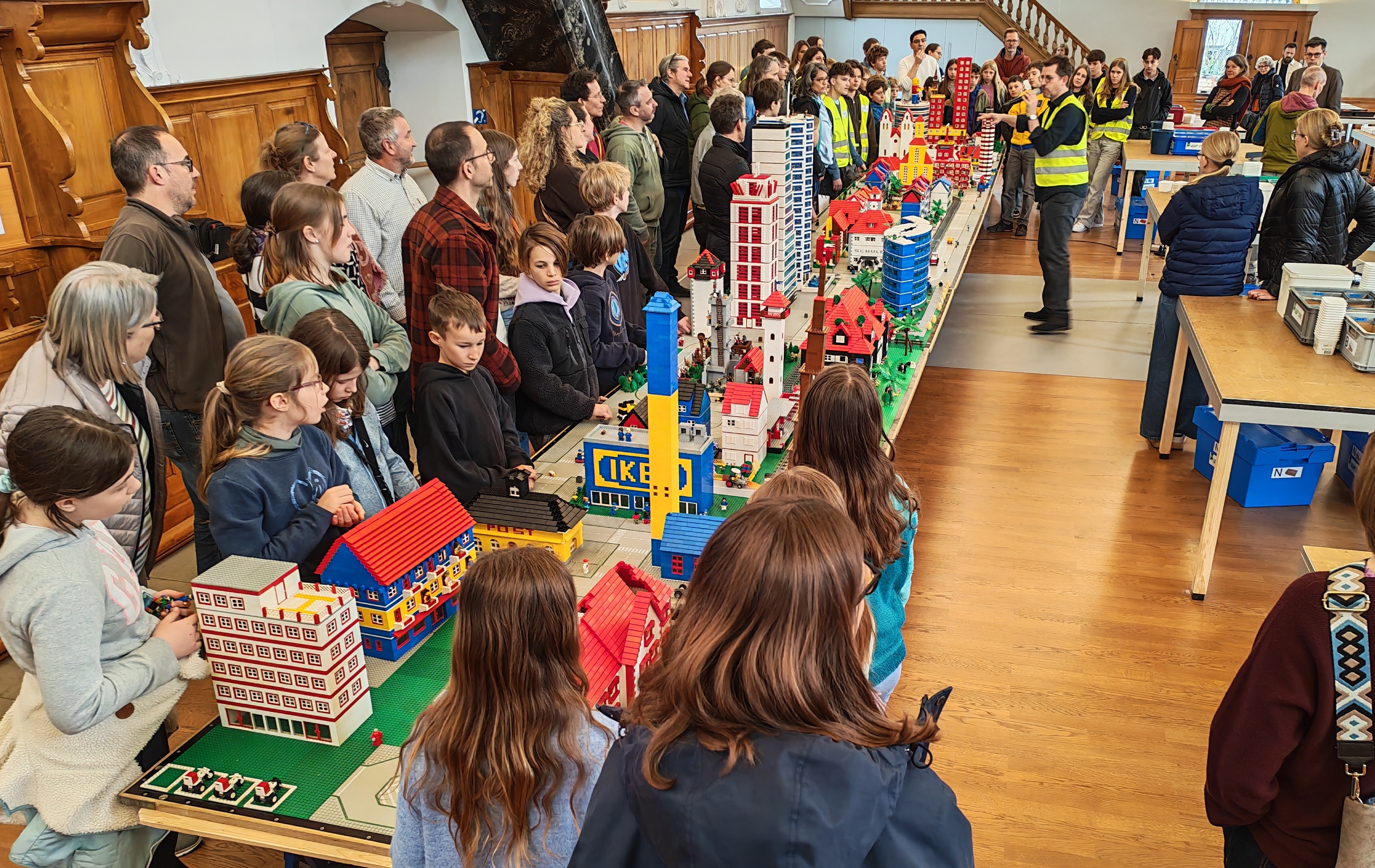 In kleinen Teams bauten alle als Einstieg zuerst einmal ein Reihenhäuschen. Und schon war man bereit für die grossen Projekte: Roche-Tower, Hotels, Schule, Stadion, Ikea, Kirchen, Flughafen und vieles mehr. Einen lebhaften Eindruck von der Bauerei und von der fertigen Stadt bekommen Sie hier unterhalb in unserem ausführlichen Fotoalbum (beim Pfeil weiterklicken).