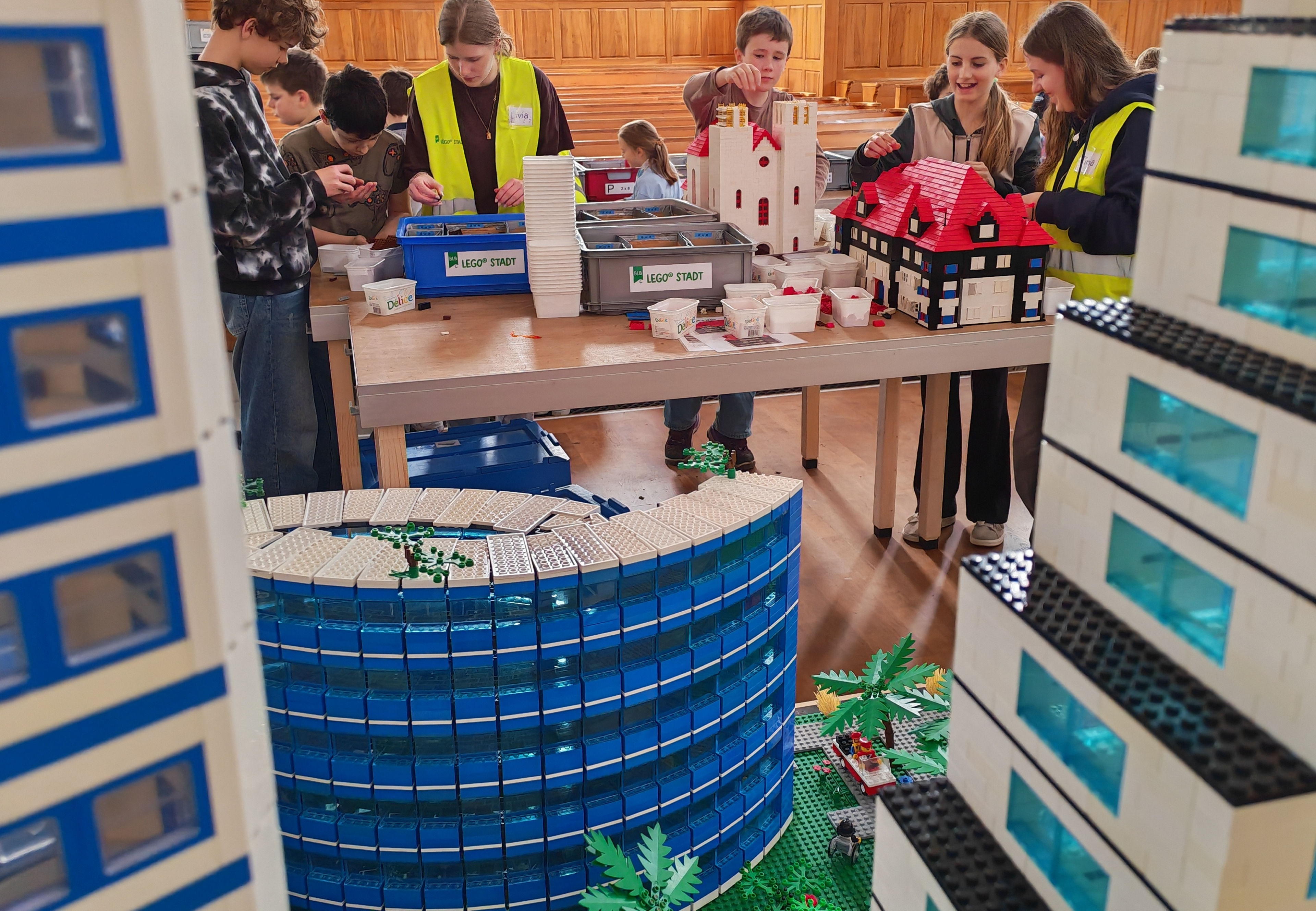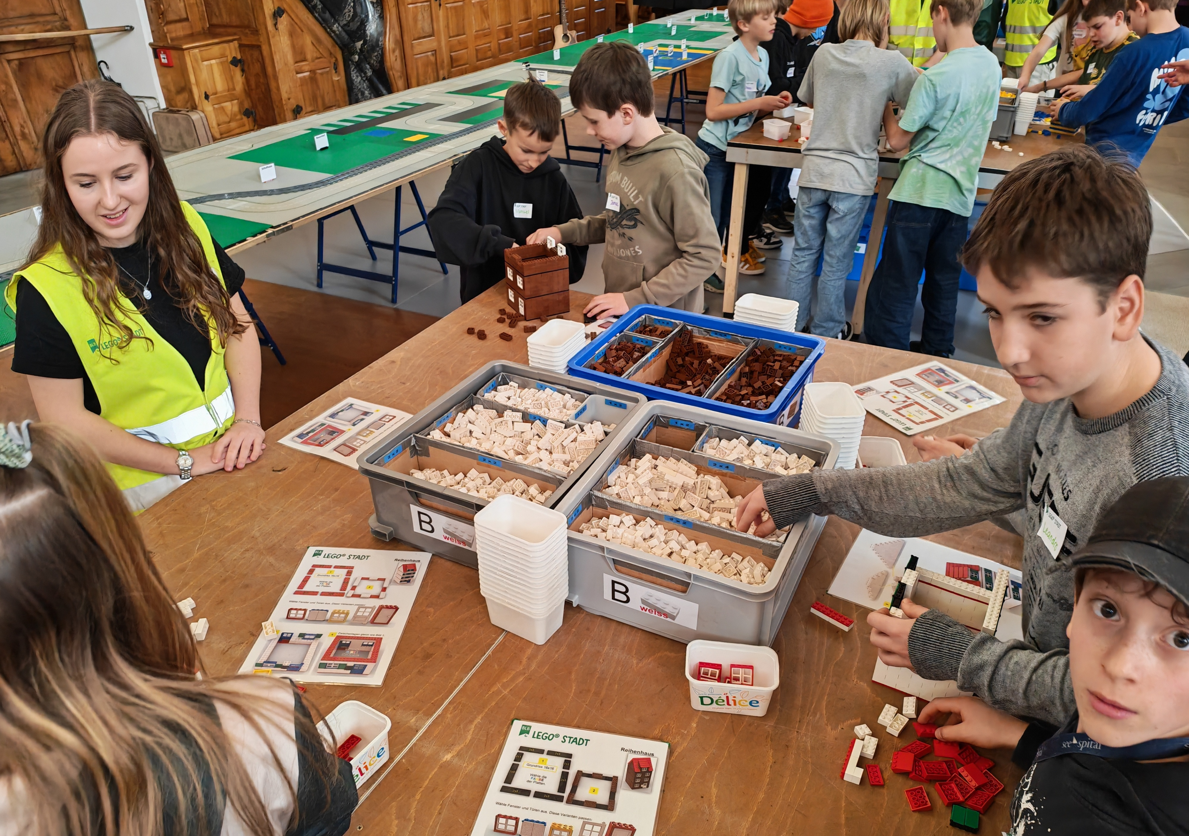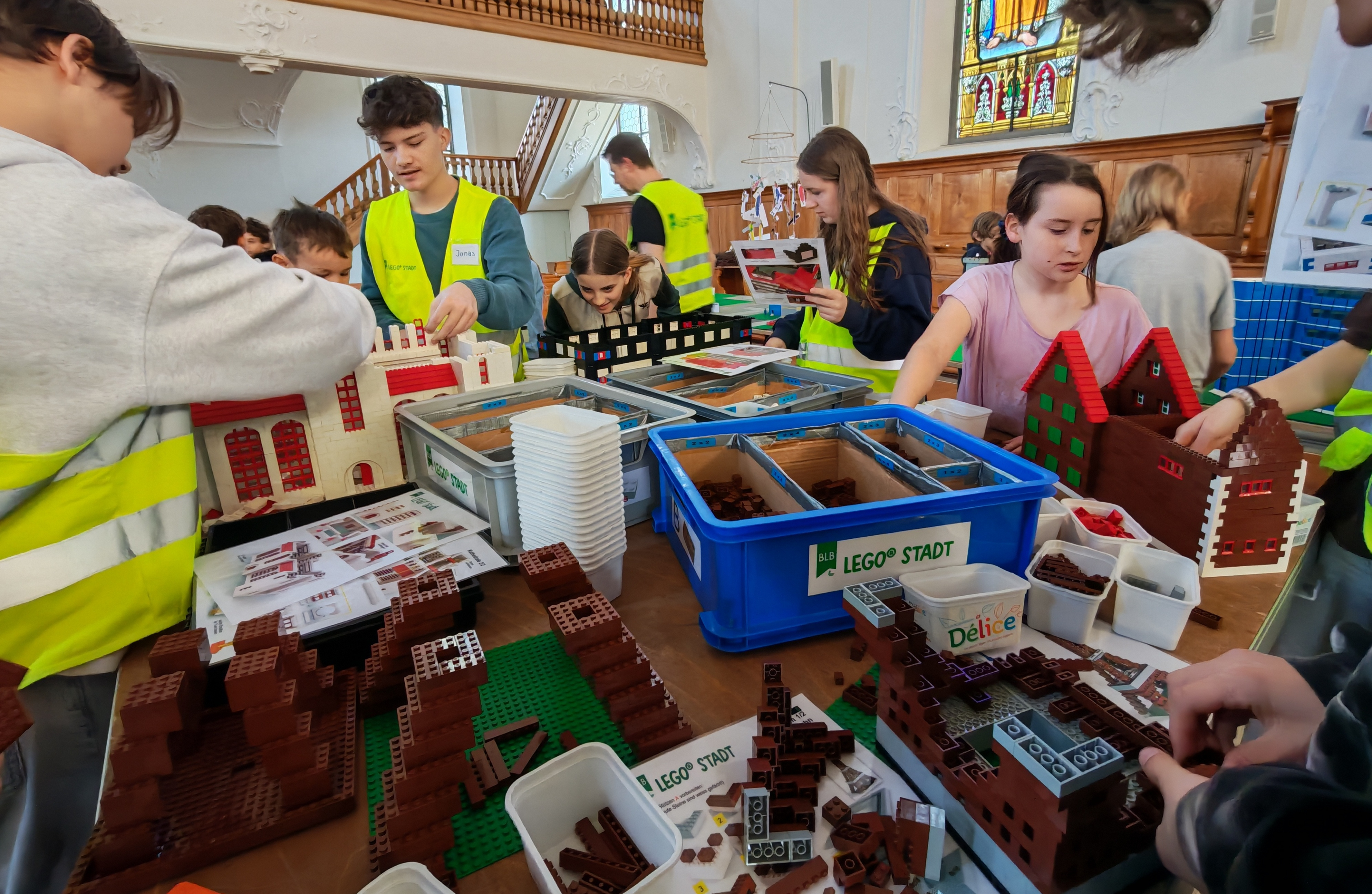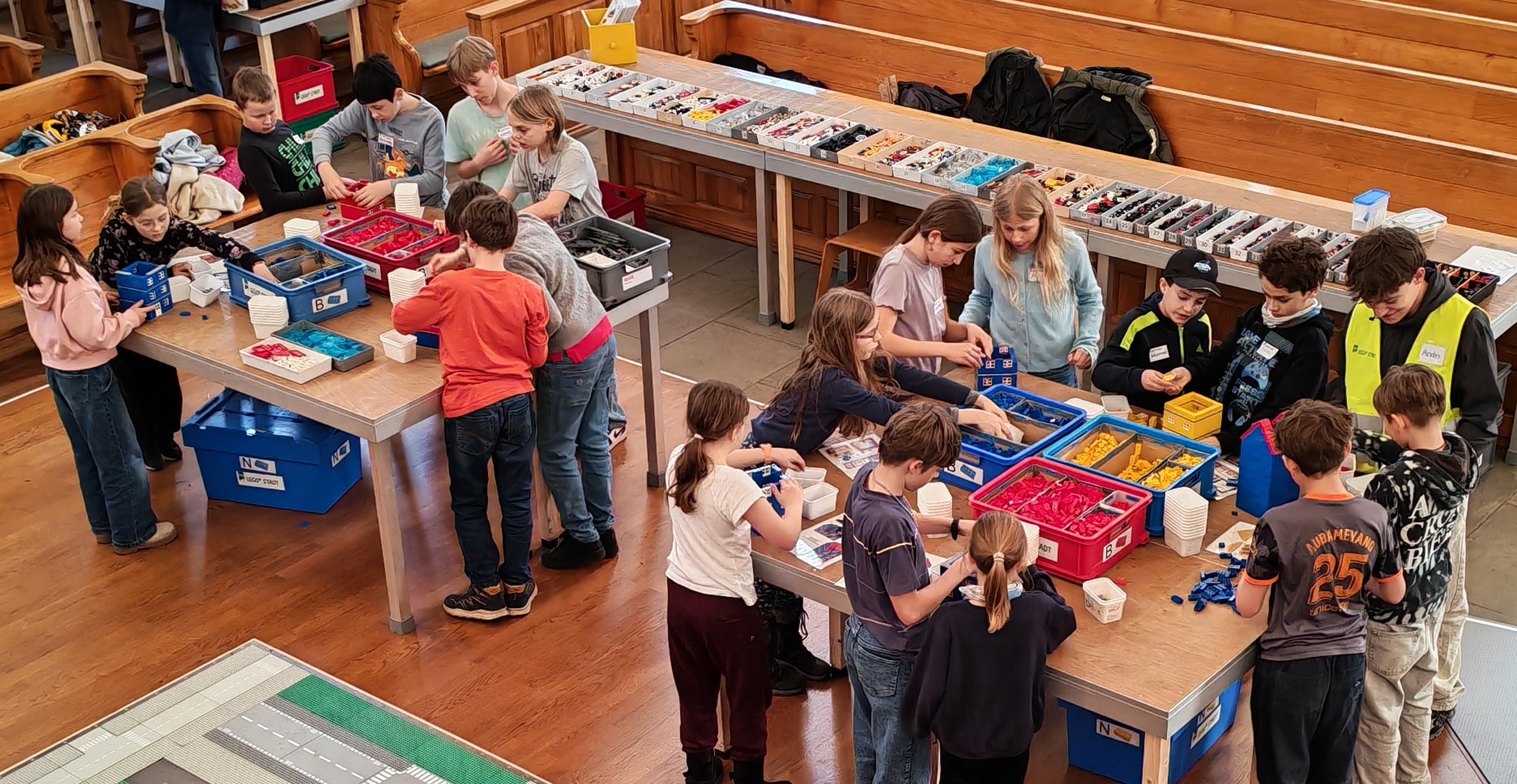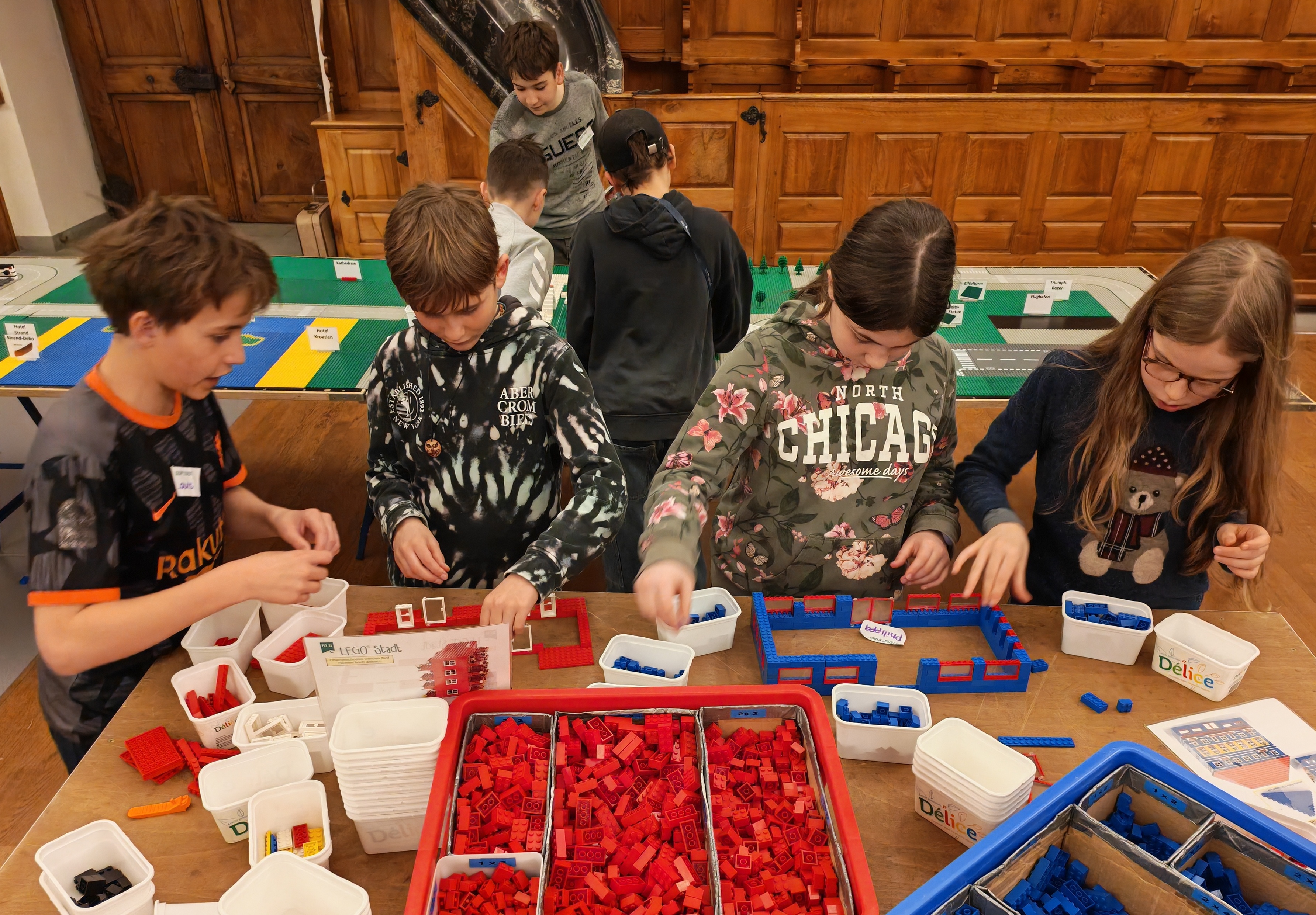 In kleinen Teams bauten alle als Einstieg zuerst einmal ein Reihenhäuschen. Und schon war man bereit für die grossen Projekte: Roche-Tower, Hotels, Schule, Stadion, Ikea, Kirchen, Flughafen und vieles mehr. Einen lebhaften Eindruck von der Bauerei und von der fertigen Stadt bekommen Sie hier unterhalb in unserem ausführlichen Fotoalbum (beim Pfeil weiterklicken).