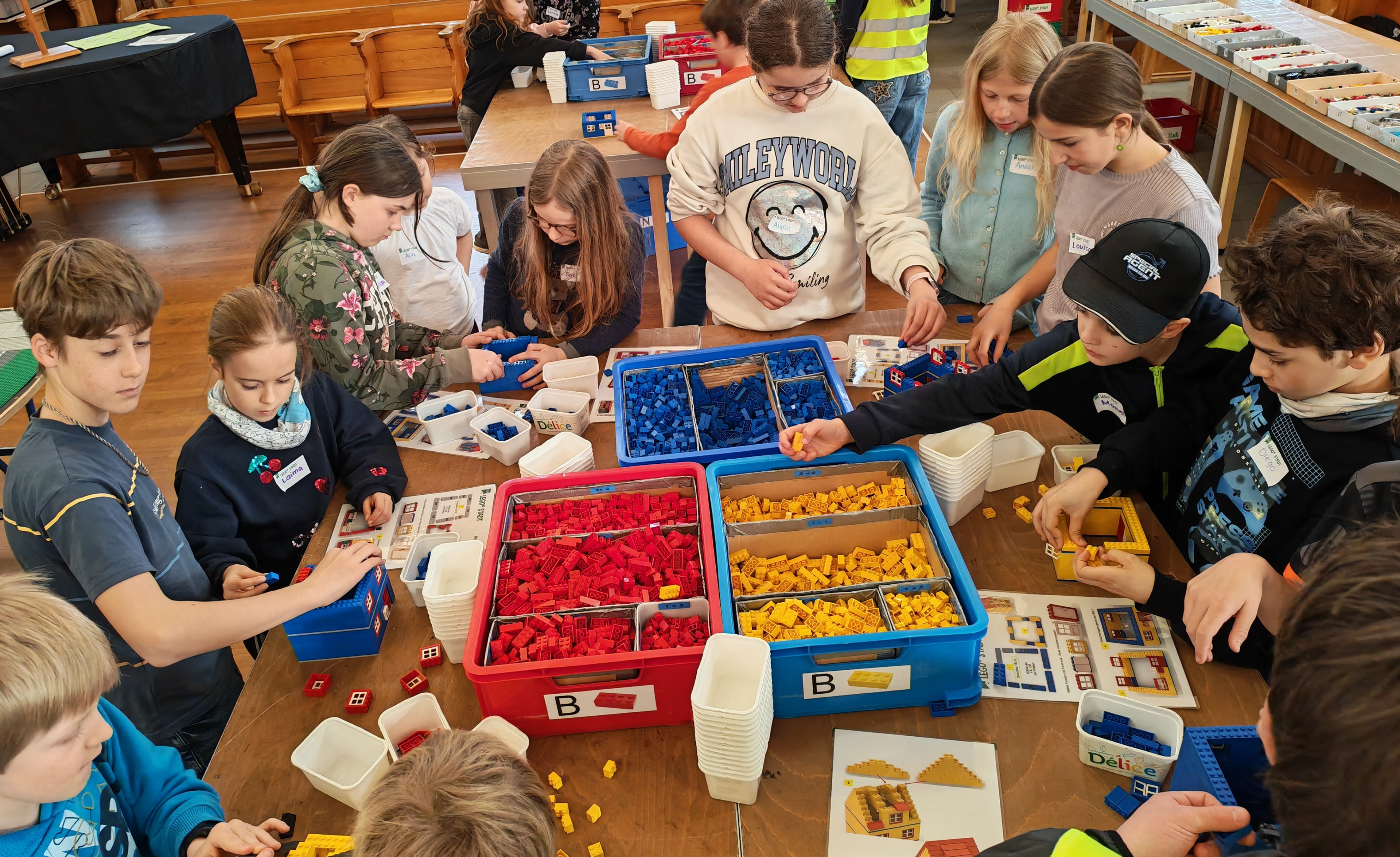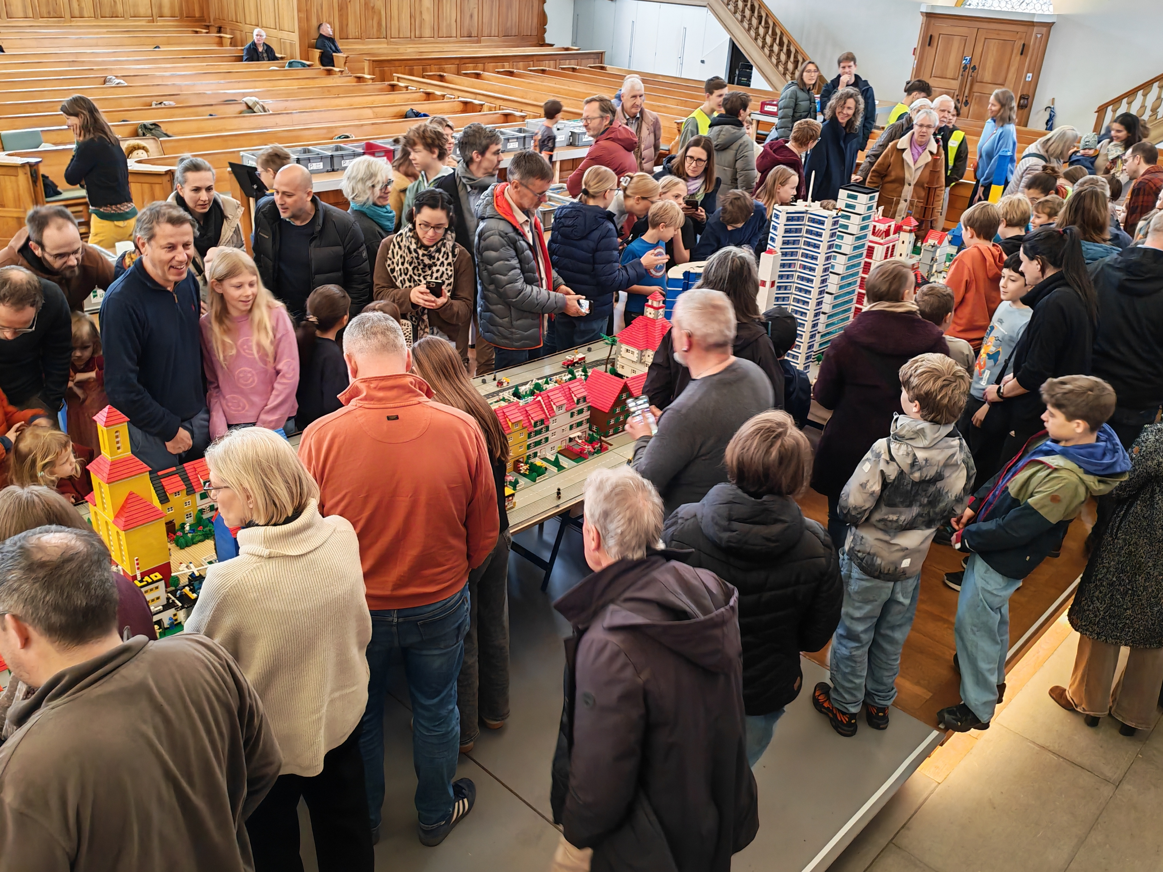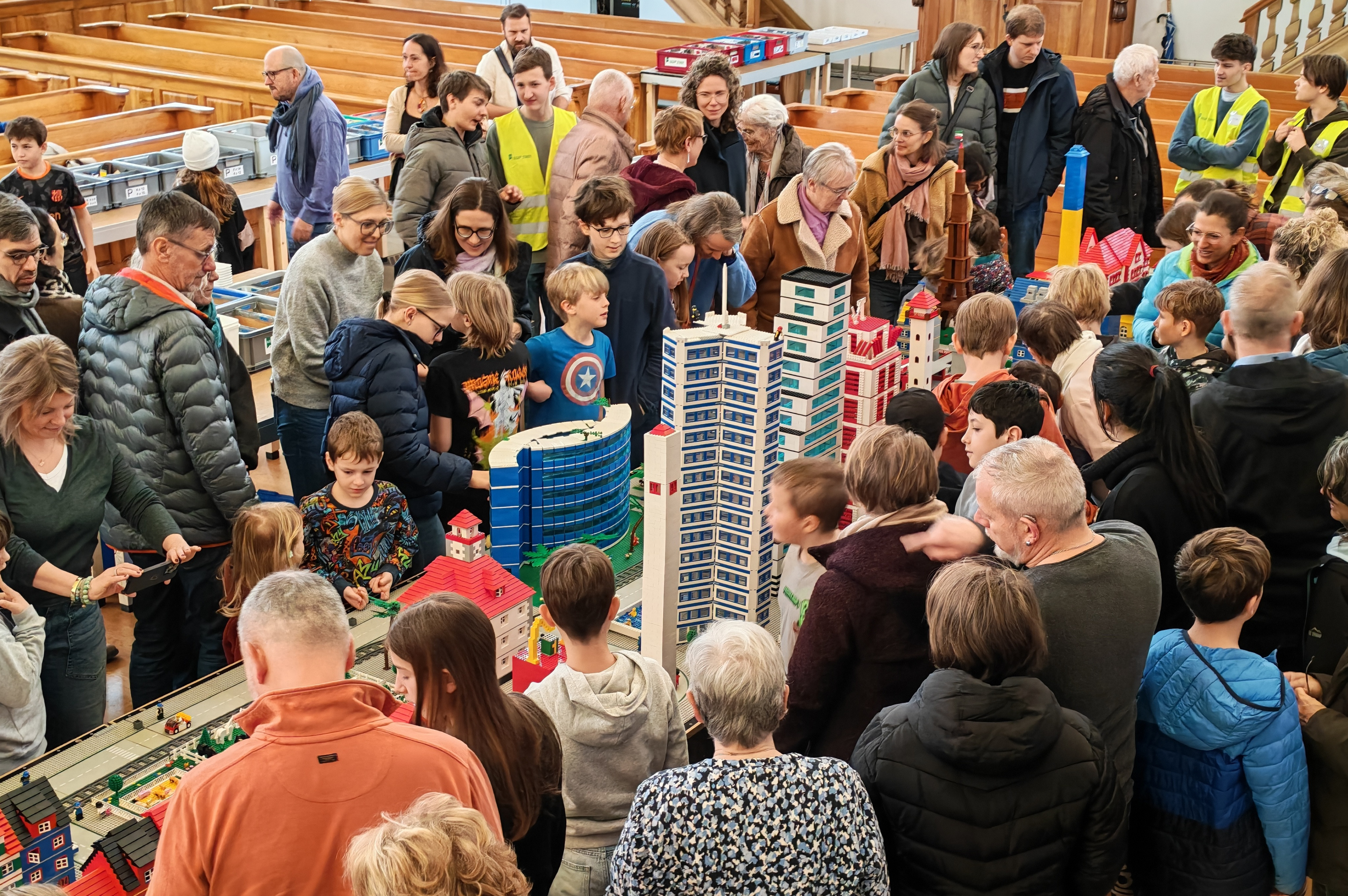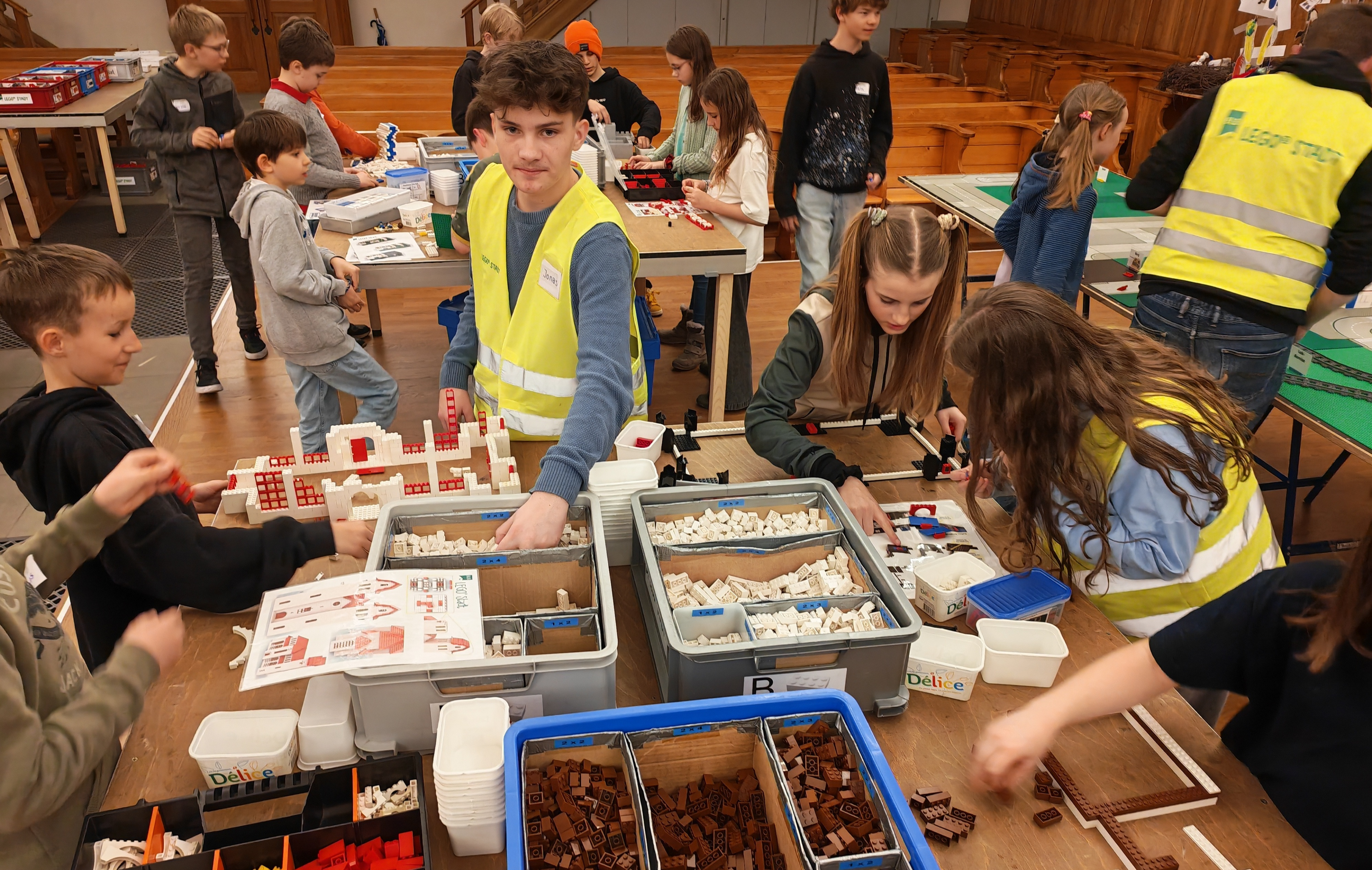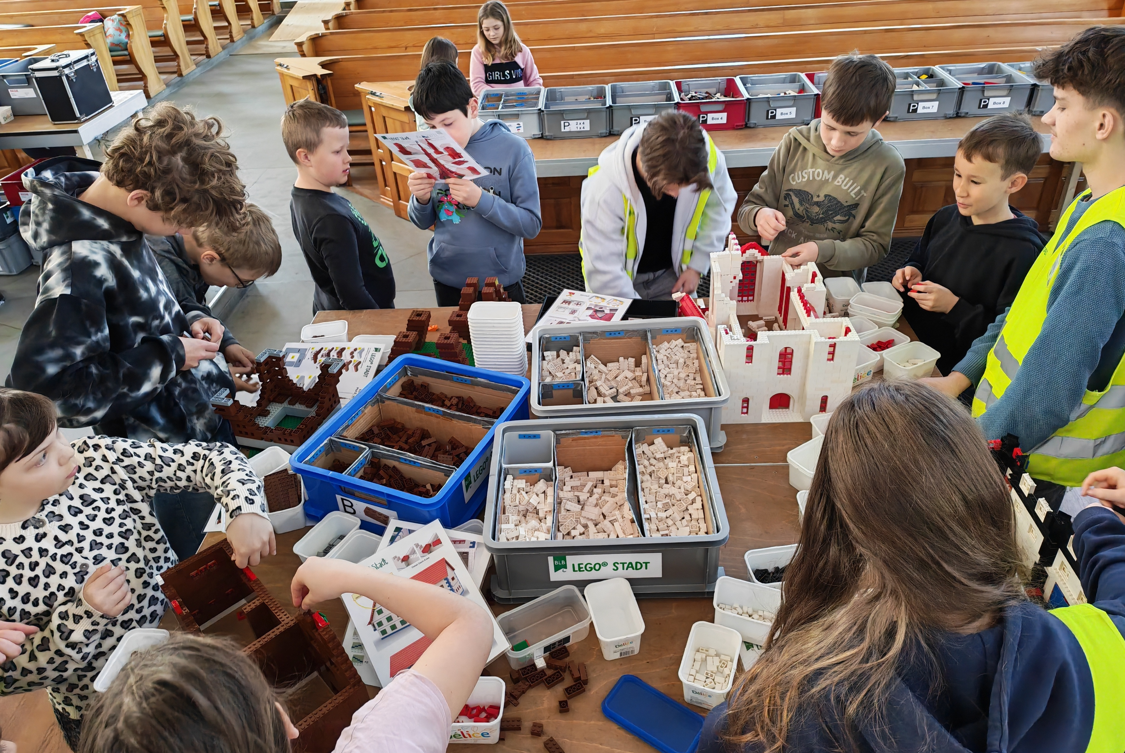 In kleinen Teams bauten alle als Einstieg zuerst einmal ein Reihenhäuschen. Und schon war man bereit für die grossen Projekte: Roche-Tower, Hotels, Schule, Stadion, Ikea, Kirchen, Flughafen und vieles mehr. Einen lebhaften Eindruck von der Bauerei und von der fertigen Stadt bekommen Sie hier unterhalb in unserem ausführlichen Fotoalbum (beim Pfeil weiterklicken).