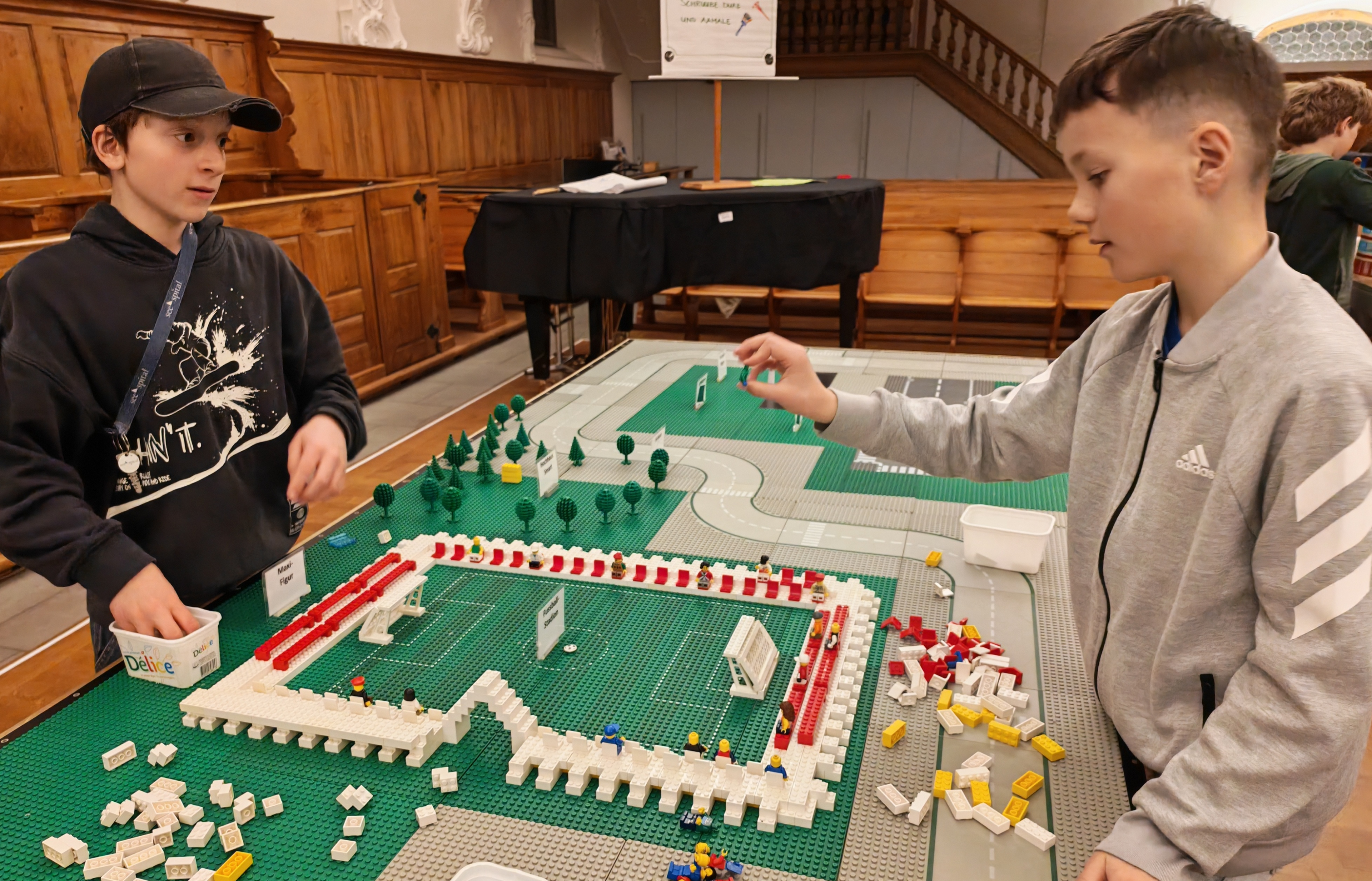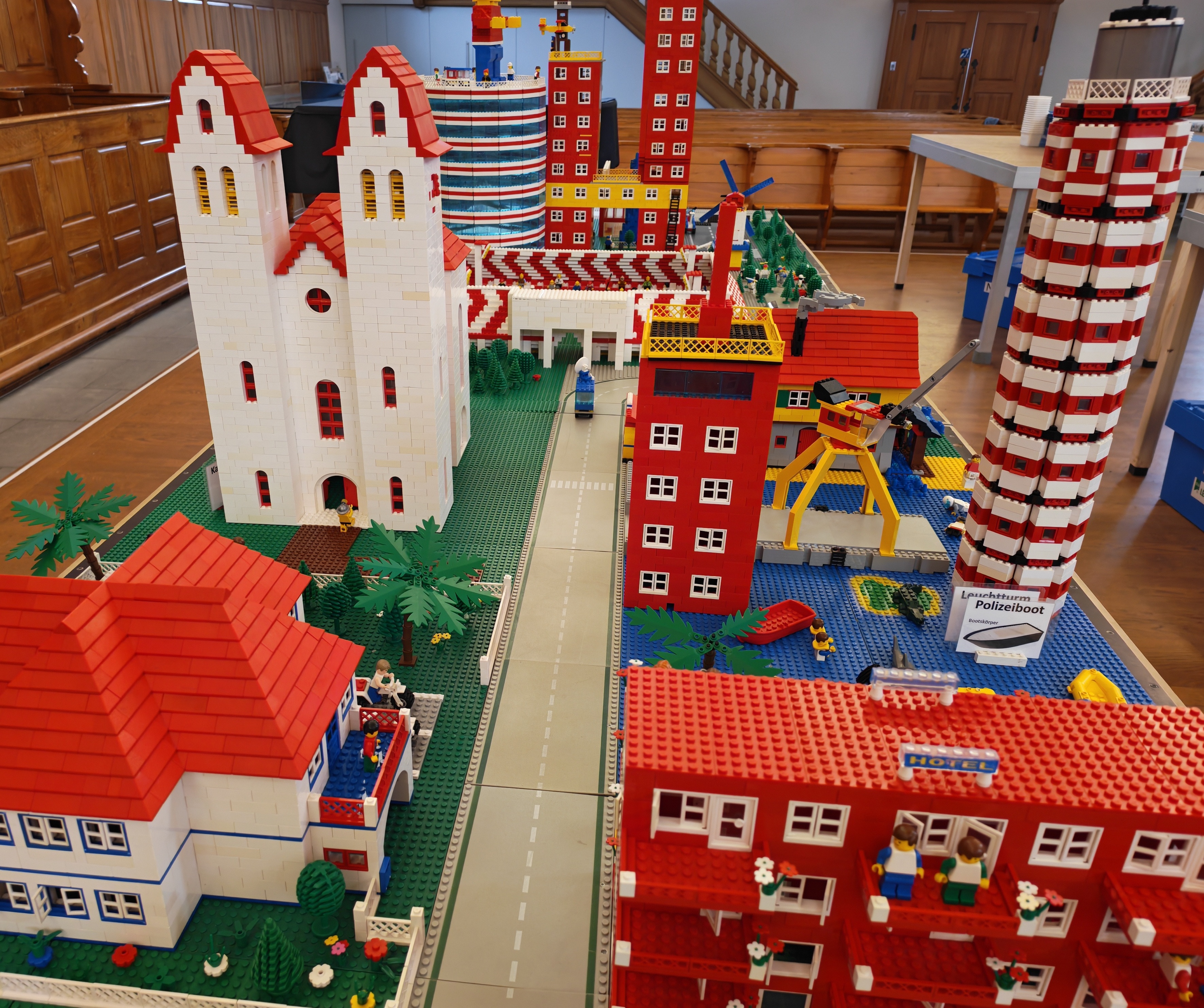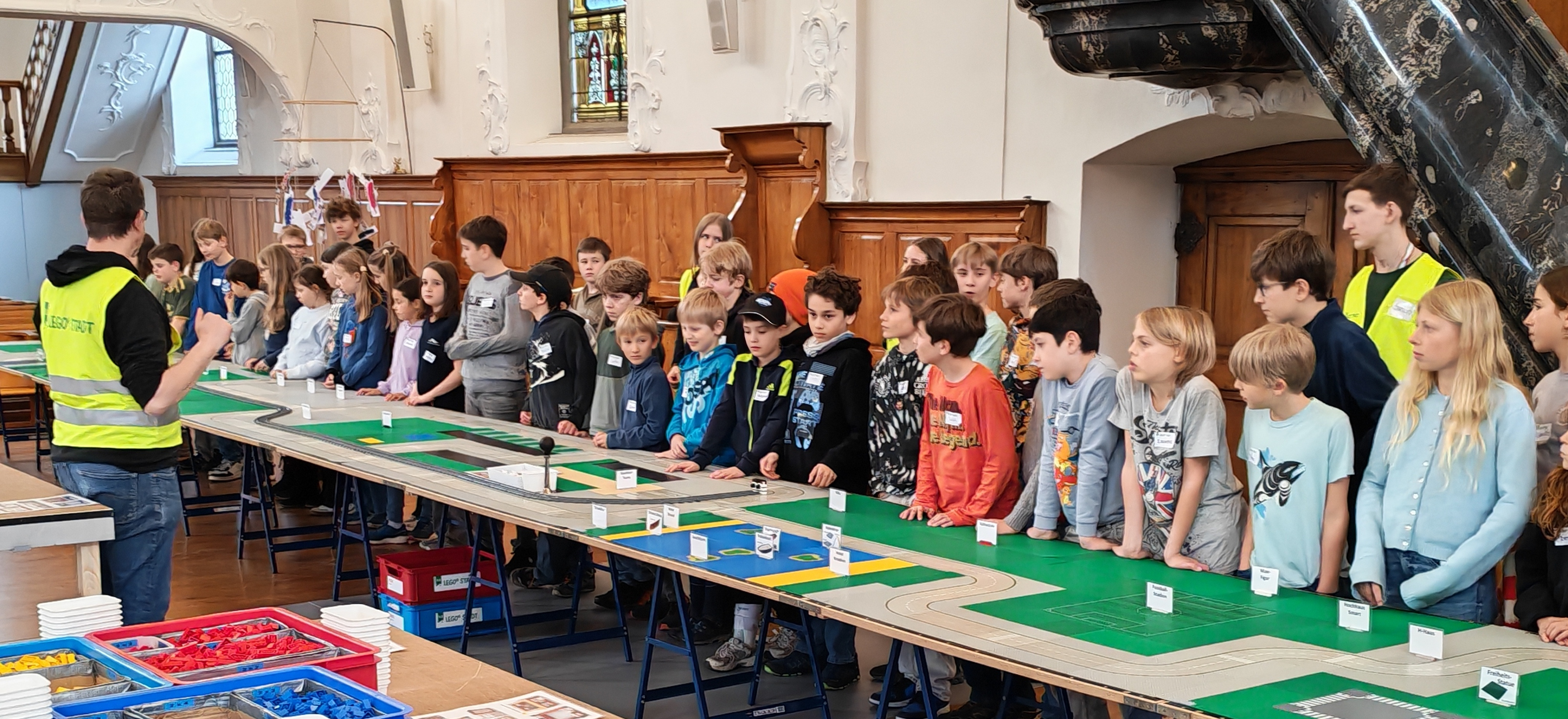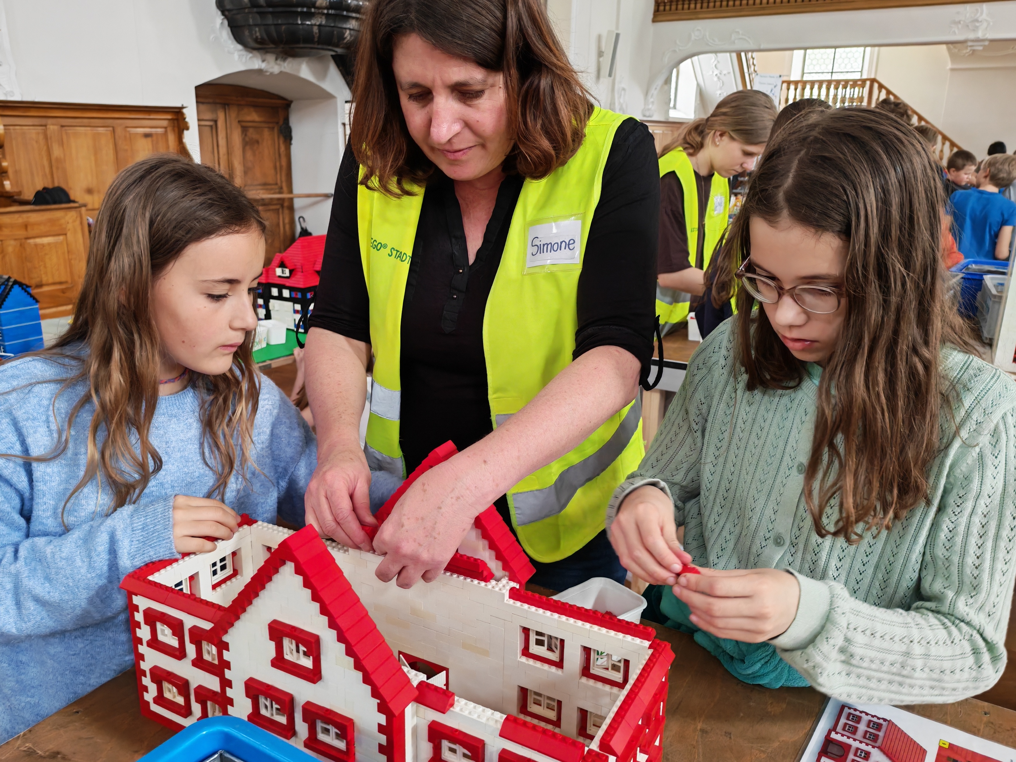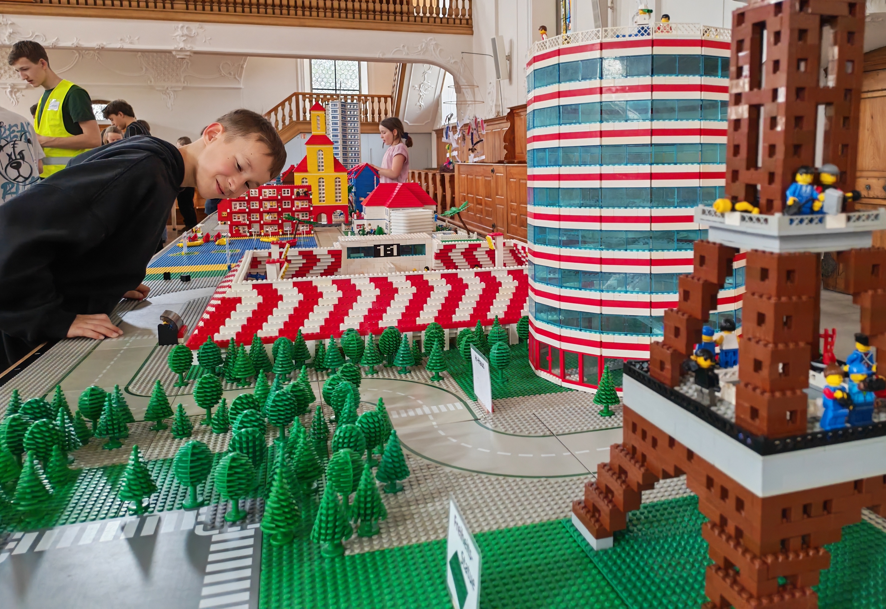 In kleinen Teams bauten alle als Einstieg zuerst einmal ein Reihenhäuschen. Und schon war man bereit für die grossen Projekte: Roche-Tower, Hotels, Schule, Stadion, Ikea, Kirchen, Flughafen und vieles mehr. Einen lebhaften Eindruck von der Bauerei und von der fertigen Stadt bekommen Sie hier unterhalb in unserem ausführlichen Fotoalbum (beim Pfeil weiterklicken).
