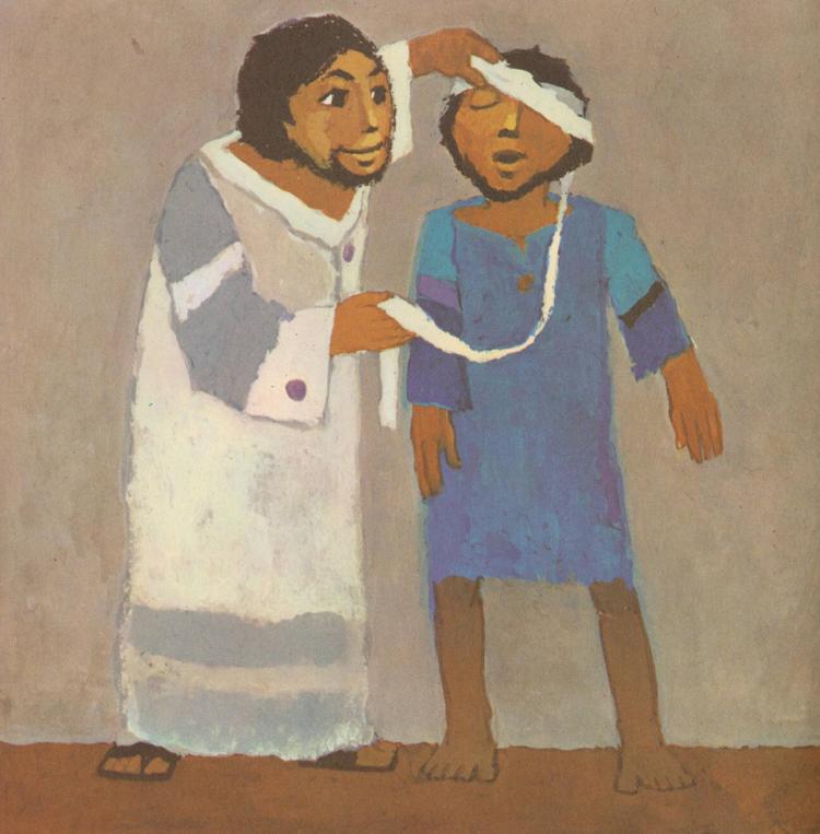 Der Mann im blauen Gewand vorne auf dem Bild - das ist der Bartimäus. Und bei ihm steht Jesus. Vielleicht erkennst du es: Jesus nimmt Bartimäus die Augenbinde ab. Die braucht dieser jetzt nämlich nicht mehr. Von einem Moment auf den anderen ist Bartimäus nicht mehr blind. Er kann sehen! Er sieht die Kinder, die ihm Geschichten erzählten, er sieht die Blume, die sie ihm geschenkt haben, er sieht auf einmal die ganze farbige Welt. Was ist da passiert?!